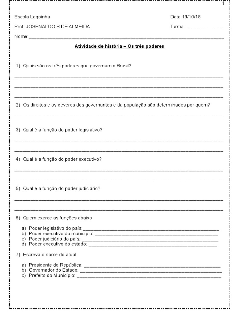 Atividades de história - Os três poderes. 1) Quais são os três poderes que governam o Brasil? 2) Os direitos e os deveres dos governantes e da população é determinada por quem? 3) Qual é a função do poder legislativo? 4) Qual é a função do poder executivo? 5) Qual é a função do poder judiciário?