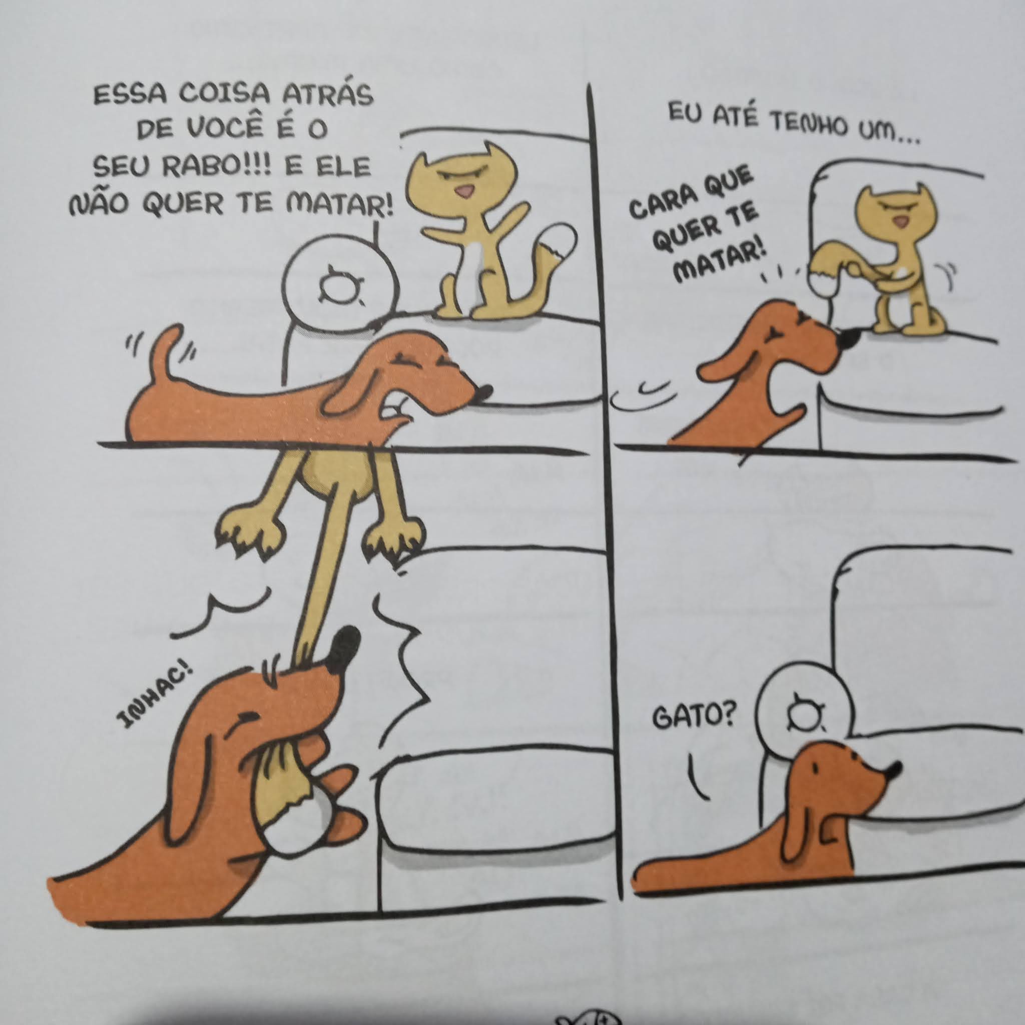 Carlos conseguiu captar muito bem as diferenças entre um e outro. Enquanto o cão faz de tudo pela atenção e abana o rabo, o gato fica na dele, te julgando, apenas observando. Não quer dizer que nenhum dos dois te ame, apenas são formas distintas de dar amor. O livro é pequeno, menos de 200 páginas, com páginas brancas e impressão.