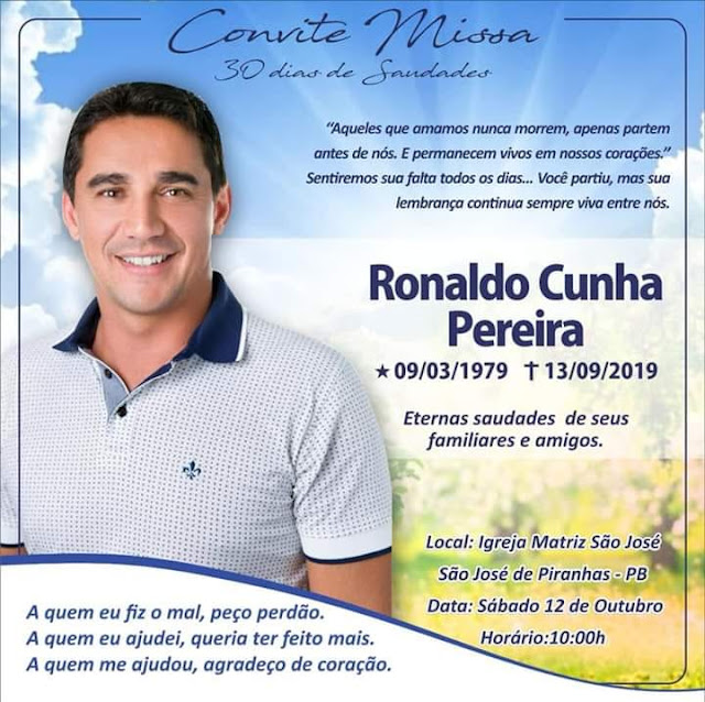 Convite Missa de um mês do falecimento de Ronaldo Cunha Pereira Blog do Ângelo Lima
