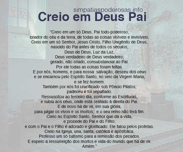 A Oração do Credo tem uma afirmação muito poderosa, ao afirmar de forma categórica que "creio em um só Deus, o Pai Todo-Poderoso, Criador de todas as coisas visíveis e invisíveis". A Oração do Credo cria um vínculo muito próprio entre você e Deus. Você ao fazer esta oração para reafirmar sua fé, pode ter certeza absoluta de.