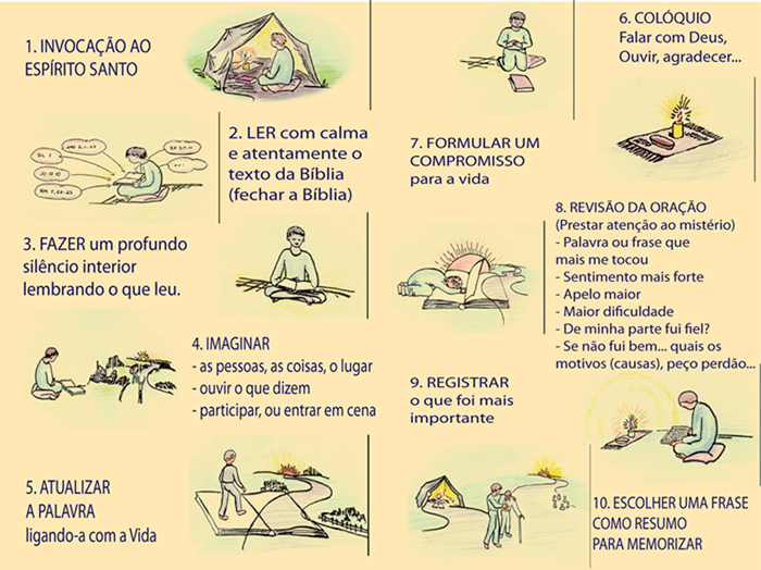 No caso da Lectio Divina (leitura orante da Palavra de Deus) é preciso seguir as leituras e o Evangelho proposto pela Igreja diariamente e a realização dos 4 passos a seguir:. 1. Leitura. 2. Meditação. 3. Oração . 4. Contemplação. Saiba como fazer passo a passo. Anos e tempos Litúrgicos. Não podemos esquecer de que na Igreja Católica existem os Tempos e Anos Litúrgicos.