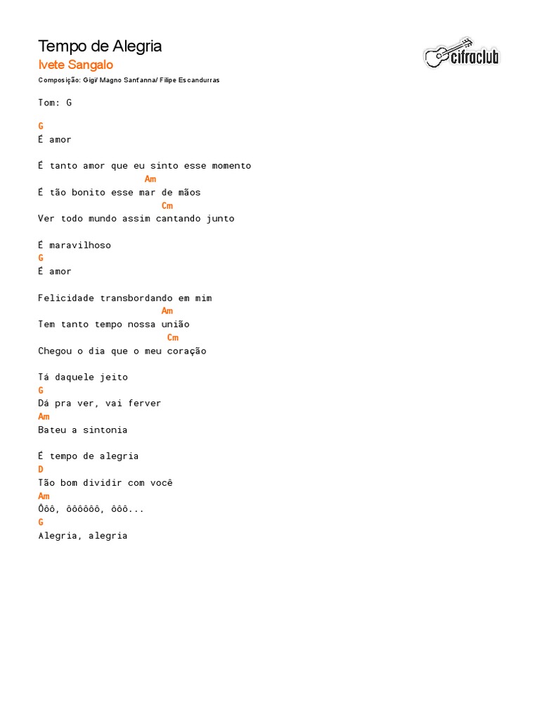 Aprenda a tocar a cifra de Tempo de Alegria (Ivete Sangalo) no Cifra Club. Oh, alegria, alegria. Cifra Club . O que você quer tocar hoje? Buscar. Mais música em Fórum Cifra Club Forme Sua Banda Letras Palco MP3. Idiomas Ver em Português Ver em Español Ver em Inglês. Studio Sol. Feito com amor em Belo Horizonte.
