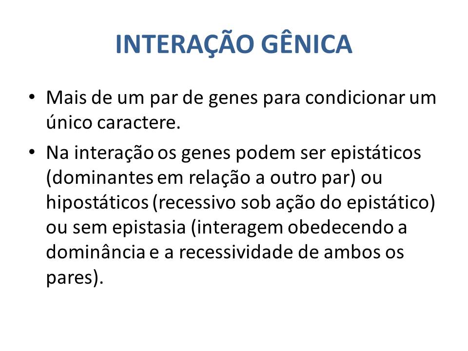 INTERAÇÃO GÊNICA. Consiste no processo pelo qual dois ou mais pares de genes, com distribuição independente, condicionam conjuntamente um único caráter. Quando os pares de alelos estão em pares de cromossomos homólogos diferentes, continuam valendo os princípios da segregação independente (2ª Lei de Mendel), sendo alteradas.
