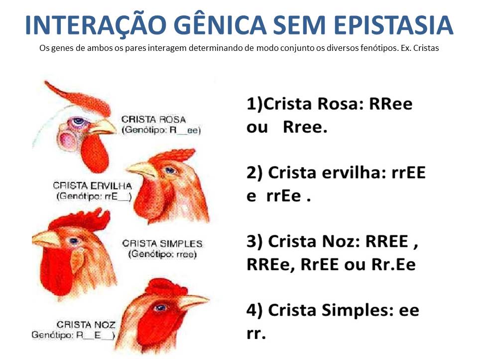 2. Interação gênica não epistática. Ocorre quando dois ou mais genes interagem para expressar uma determinada característica, mas nenhum alelo impede a expressão do outro. Exemplo: Determinação da crista em galináceos. As combinações entre os diferentes alelos podem produzir quatro tipos de crista: rosa, ervilha, noz e simples.