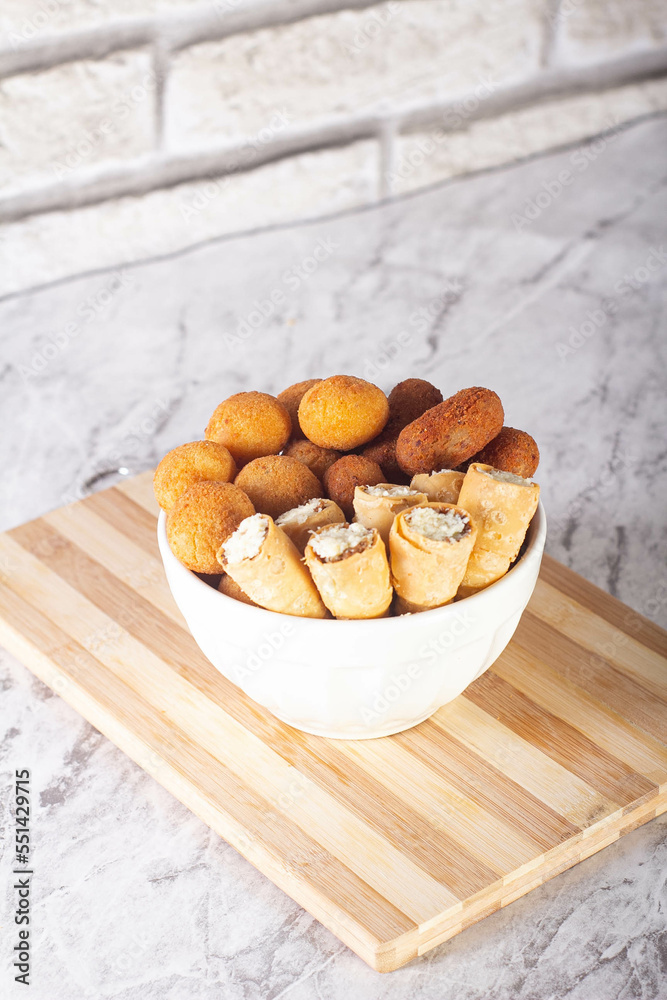 mix de mini salgados brasileiros típicos de festas de aniversário coxinha rabinho de tatu e