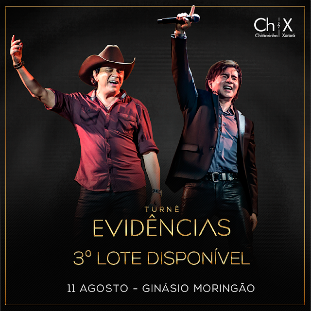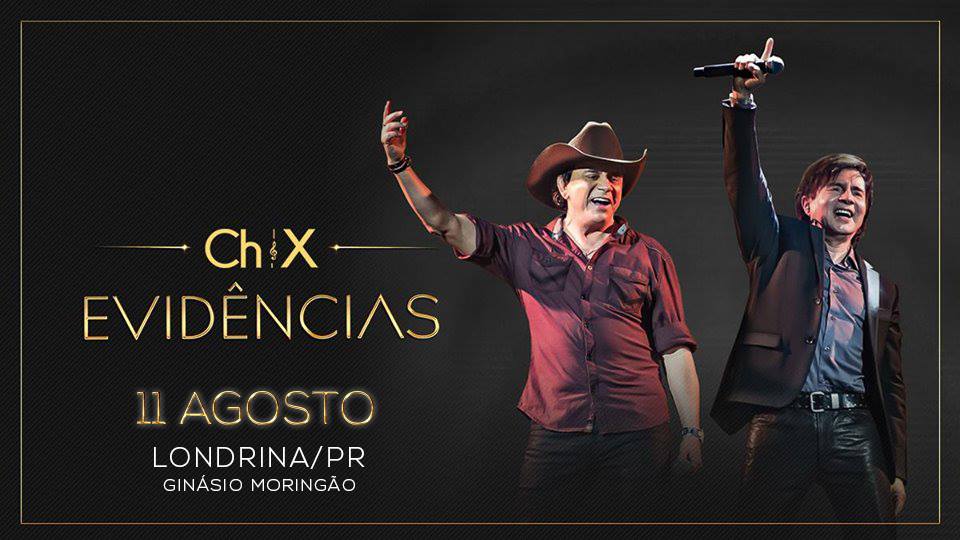 Chitãozinho e Xororó em Londrina com a Turnê Evidências. Data: 11 de agosto, sábado, às 21h. Endereço: Ginásio Moringão. Rua Gomes Carneiro, 315. Classificação etária: 18 anos. Entrada: A partir de R$ 65,00 mais 1 kg de alimento. QUER ASSISTIR AO SHOW NA FAIXA? Baixe o APP "VC na RPC" no seu tablet ou smartphone;